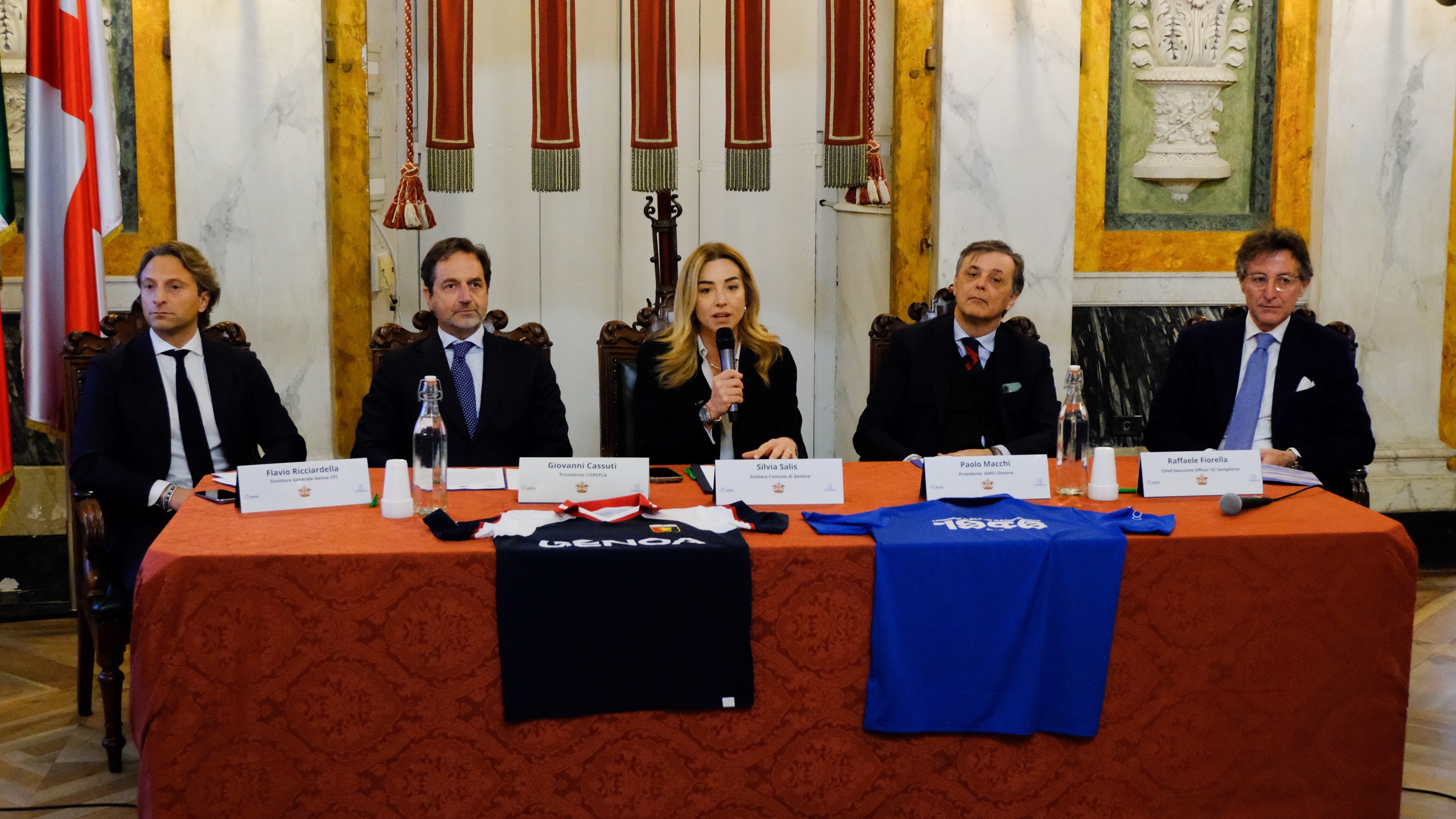 A Palazzo Tursi è stata presentata la nuova campagna di raccolta delle bottiglie in PET promossa da AMIU Genova insieme a Corepla, con il coinvolgimento di Genoa CFC e UC Sampdoria.