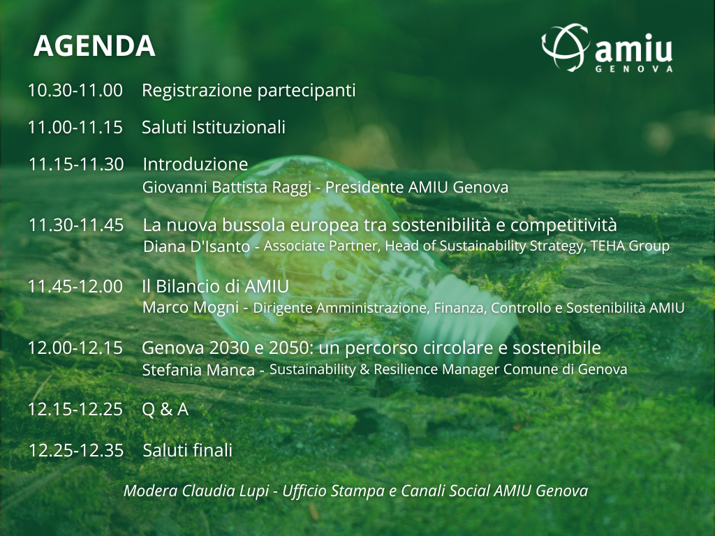 Di seguito l’agenda dell’incontro che vedrà gli interventi di: Silvia Pericu – Assessora all’Ambiente, Ciclo rifiuti, sostenibilità ed economia circolare Comune di Genova; Stefania Manca – Sustainability & Resilience Manager Comune di Genova; Giovanni Battista Raggi – Presidente AMIU Genova, Marco Mogni – Dirigente Area Amministrazione, Finanza, Controllo e Sostenibilità AMIU Genova; Diana D’Isanto – Associate Partner, Head of Sustainability Strategy, TEHA Group.