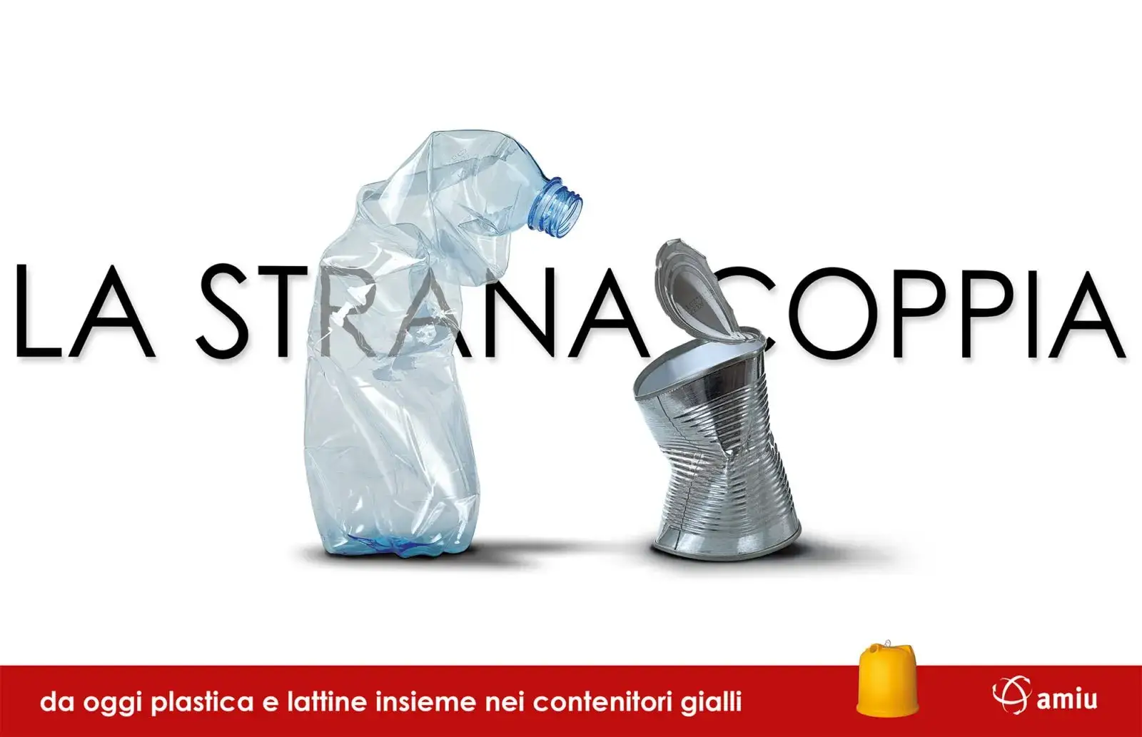 Plastica e lattine vanno buttate insieme nel contenitore giallo. Per ricordarlo ai genovesi una campagna a doppio soggetto. Tema le “strane coppie”